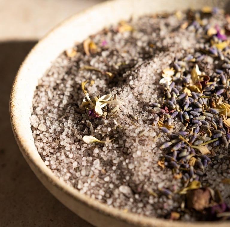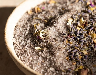 We use medical-grade Epsom salt and magnesium-rich mineral salts that dissolve easily in warm water to create a deeply restorative bath environment. Magnesium-rich salts such as Epsom salt and magnesium flakes help relax muscles, ease tension, support the body's natural recovery processes, and promote a state of calm and relaxation.